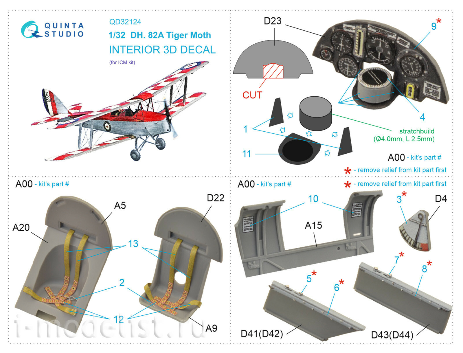 QD32124 Quinta Studio 1/32 3D Декаль интерьера кабины DH 82A Tiger Moth (ICM)