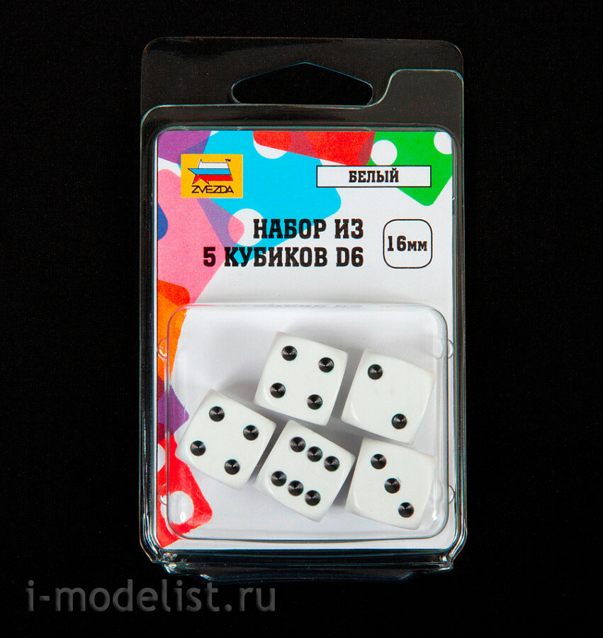 1213 Zvezda Набор из 5 кубиков D6, 16мм. Белый с черными точками в блистере