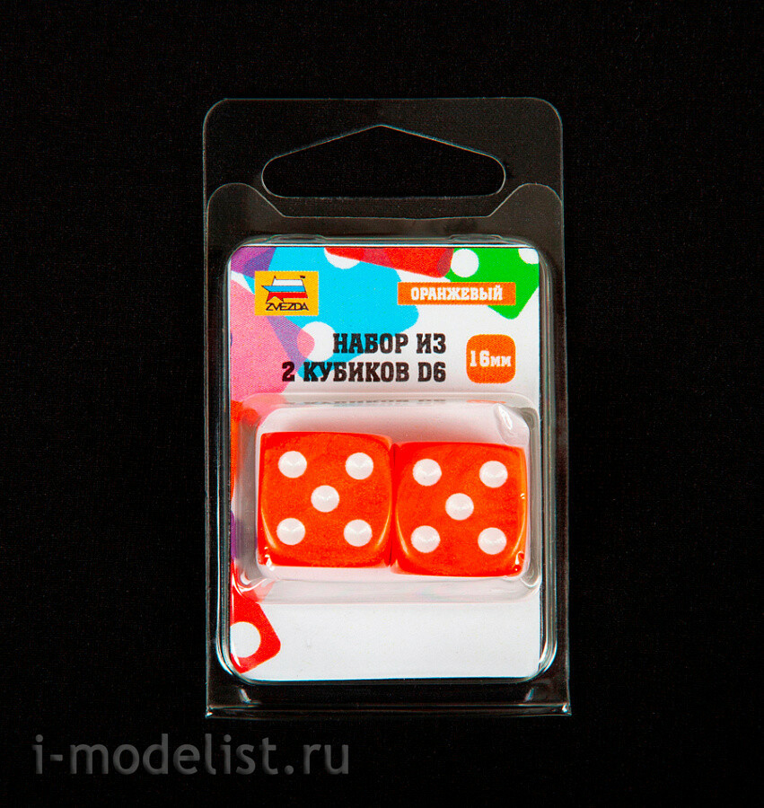 1232 Zvezda Набор из 2 кубиков D6, 16мм. Оранжевый с белыми точками в блистере