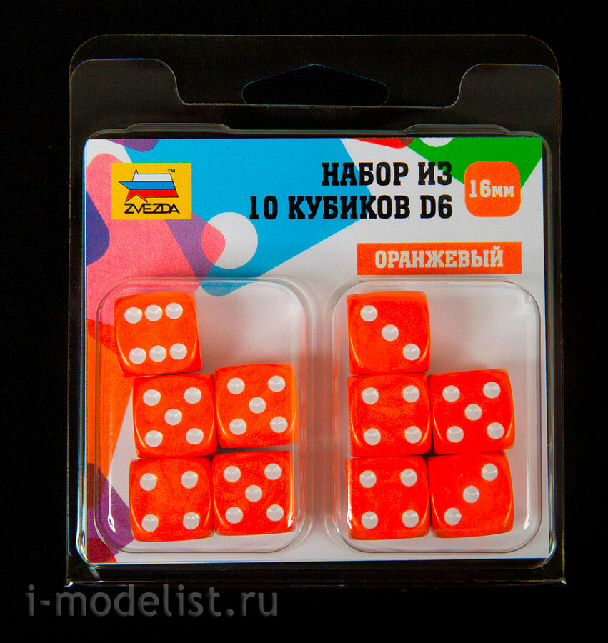 1234 Zvezda Набор из 10 кубиков D6, 16мм. Оранжевый с белыми точками в блистере