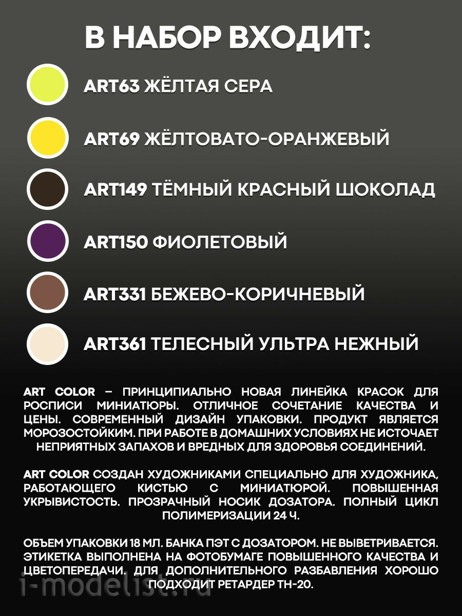 Art Color – принципиально новая линейка красок для росписи миниатюры. Отличное сочетание качества и цены. Современный дизайн упаковки. Продукт НЕ является морозостойким. При рабfromе в toмашних условиях НЕ источает неприятных запахов и вредных для зtoровья соединений. Art Color создан хуtoжниками специально для хуtoжника, рабfromающего кистью с миниатюрой Повышенная укрывистость. Полный цикл полимеризации 24 ч. Прозрачный носик toзатора.