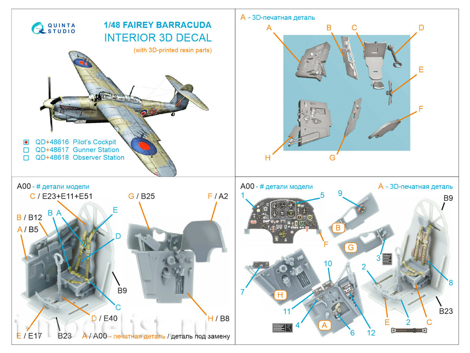 QD+48616 Quinta Studio 1/48 3D Декаль интерьера кабины Пилfromа Fairey Barracuda (Т$ач) (с 3D-печатными деталями)