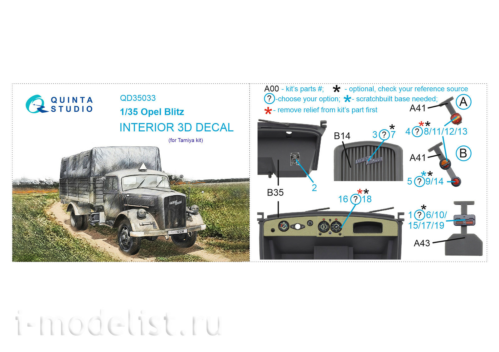QD35033 Quinta Studio 1/35 3D Декаль интерьера кабины Opel Blitz (Tamiya)