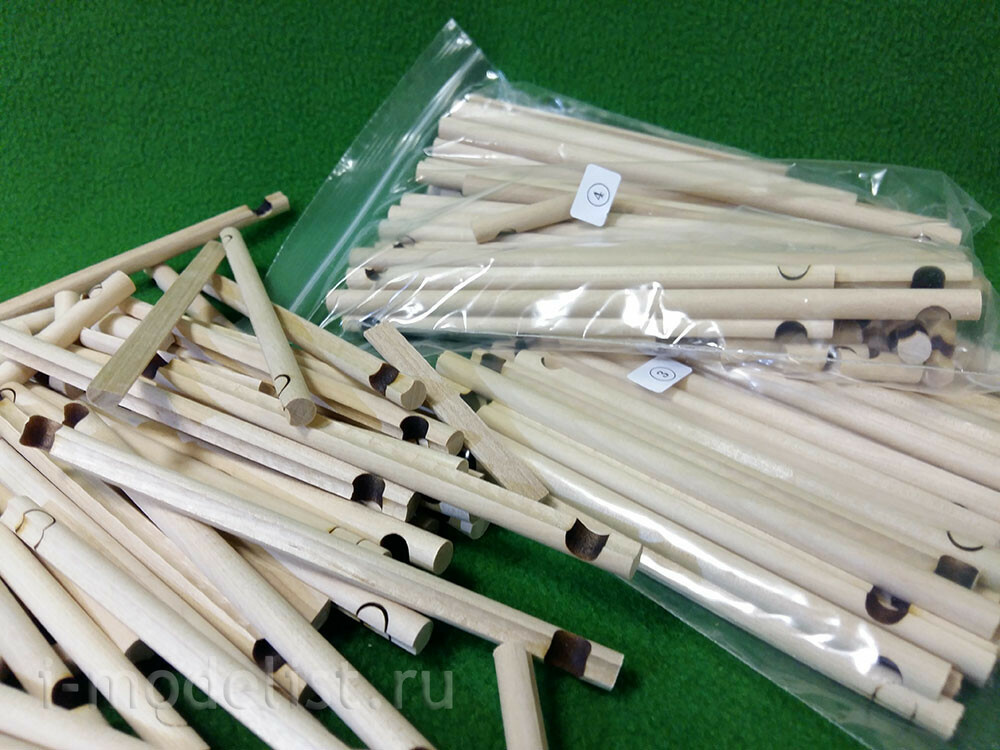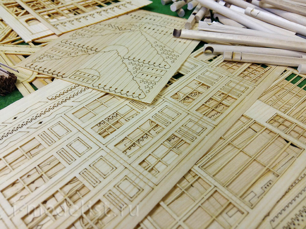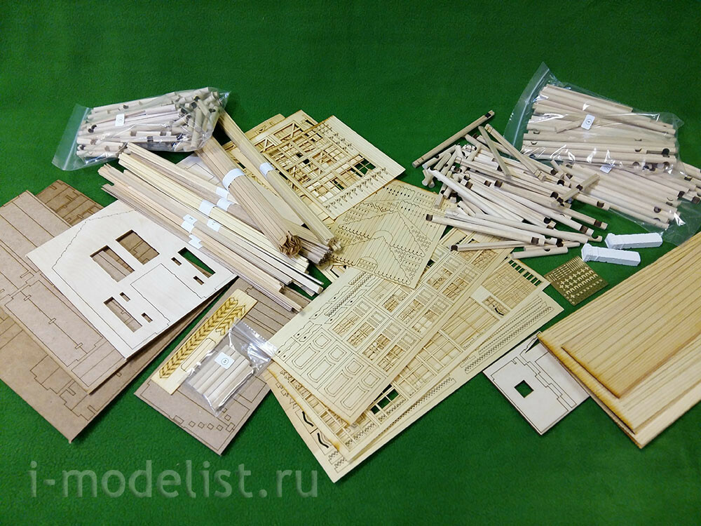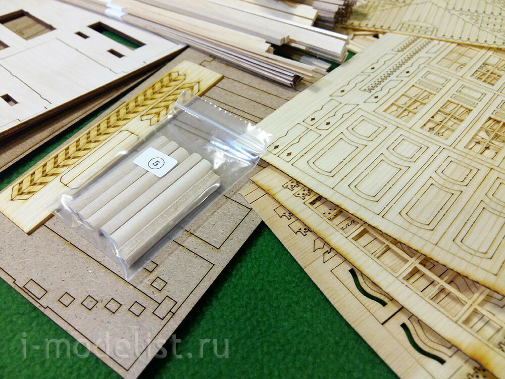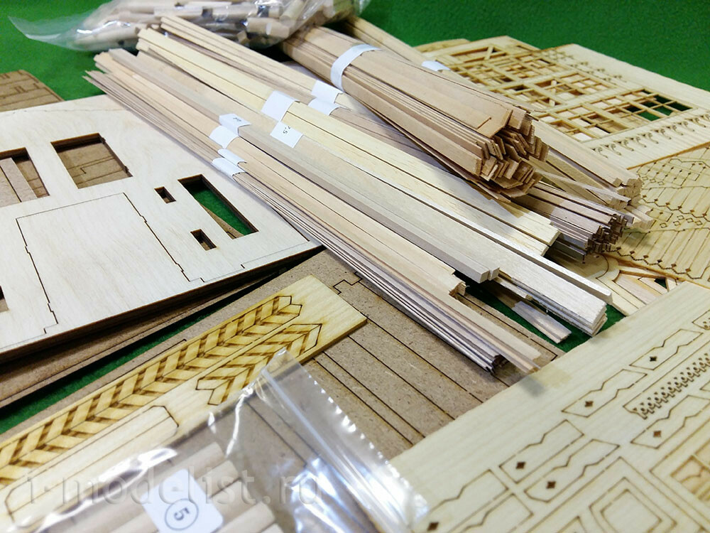 In a set of 5 packages with logs with a diameter of 8 mm, having a longitudinal groove (maturation) and already cut cups. 16 sheets of laser cutting veneer 0.6, 1, 1.5 and 2 mm. photo Etching, plastic for Windows and doors.