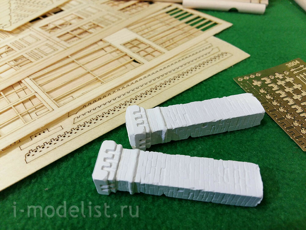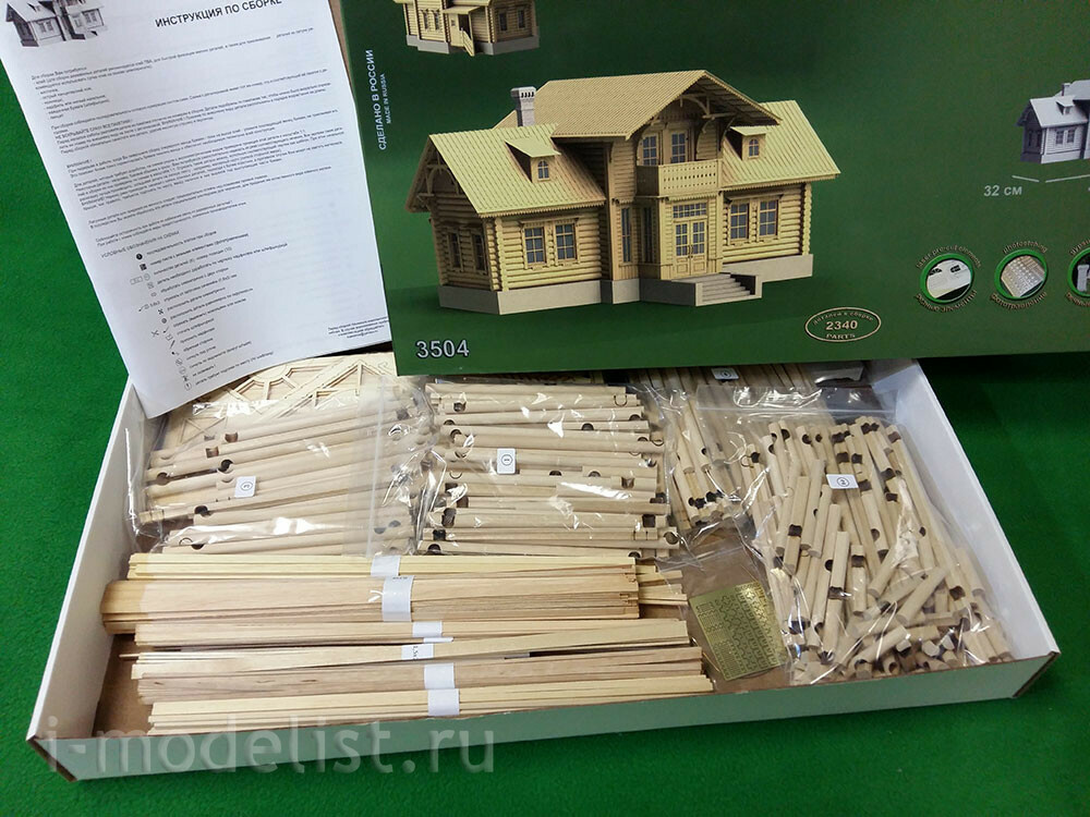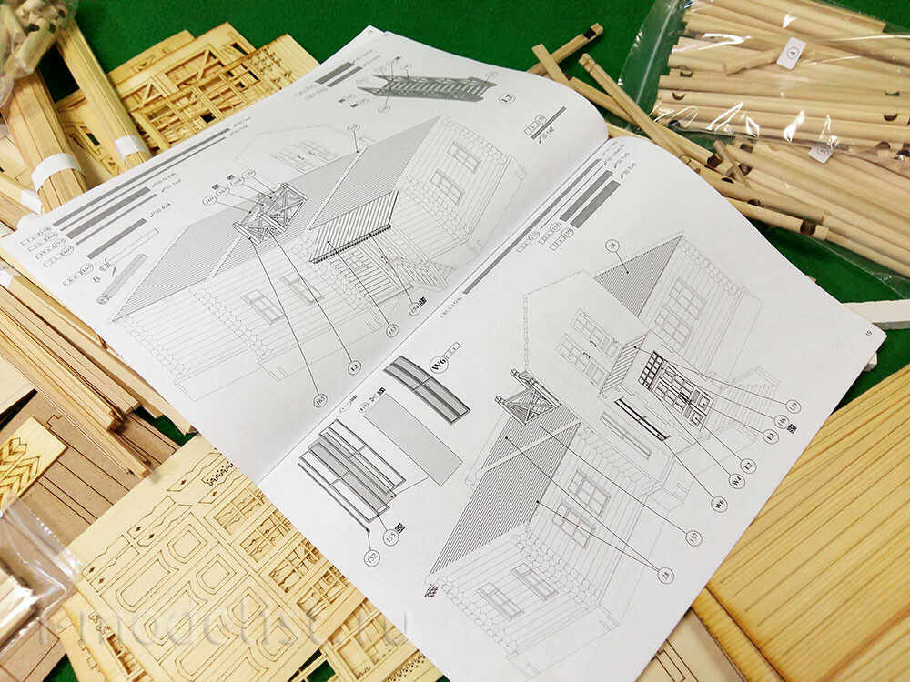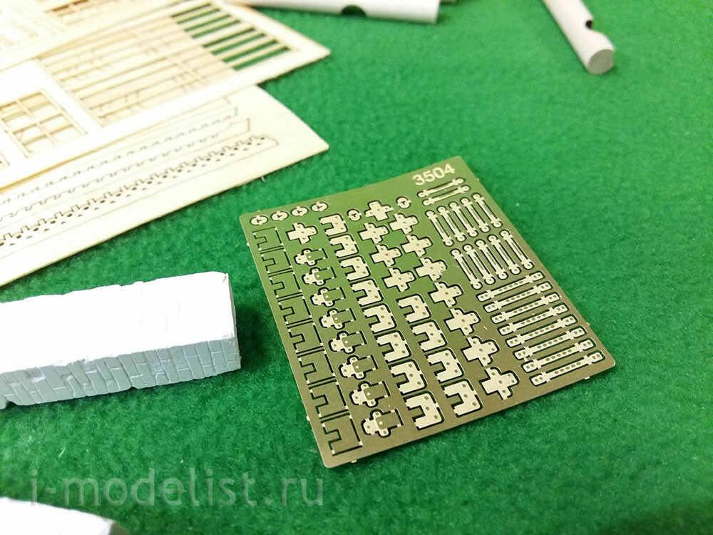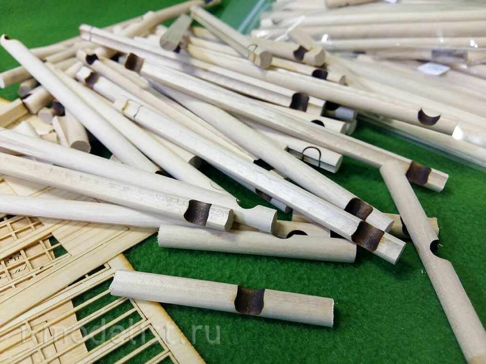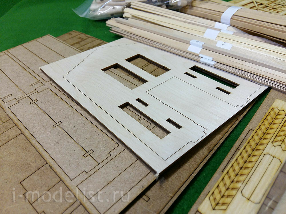 In a set of 5 packages with logs with a diameter of 8 mm, having a longitudinal groove (maturation) and already cut cups. 16 sheets of laser cutting veneer 0.6, 1, 1.5 and 2 mm. photo Etching, plastic for Windows and doors.