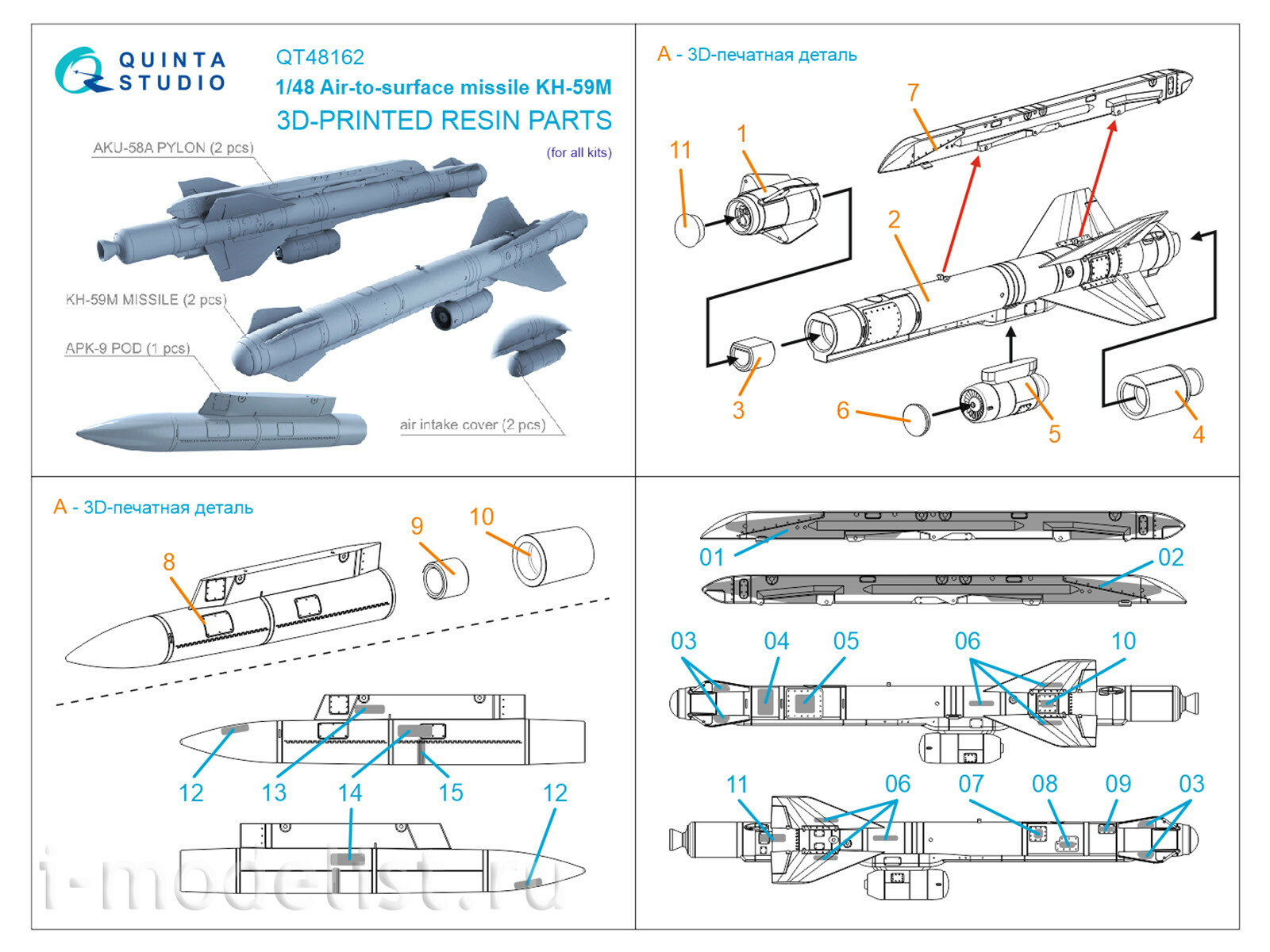 QT48162 Quinta Studio 1/48 Ракеты «воздух-поверхность» Х-59М с пусковыми устройствами и контейнером целеуказания, 2 шт. all мод
