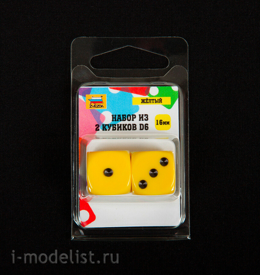 1224 Zvezda Набор из 2 кубиков D6, 16мм. Желтый с черными точками в блистере