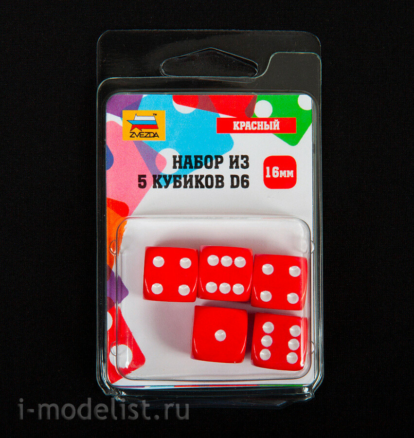 1229 Zvezda Набор из 5 кубиков D6, 16мм. Красный с белыми точками в блистере