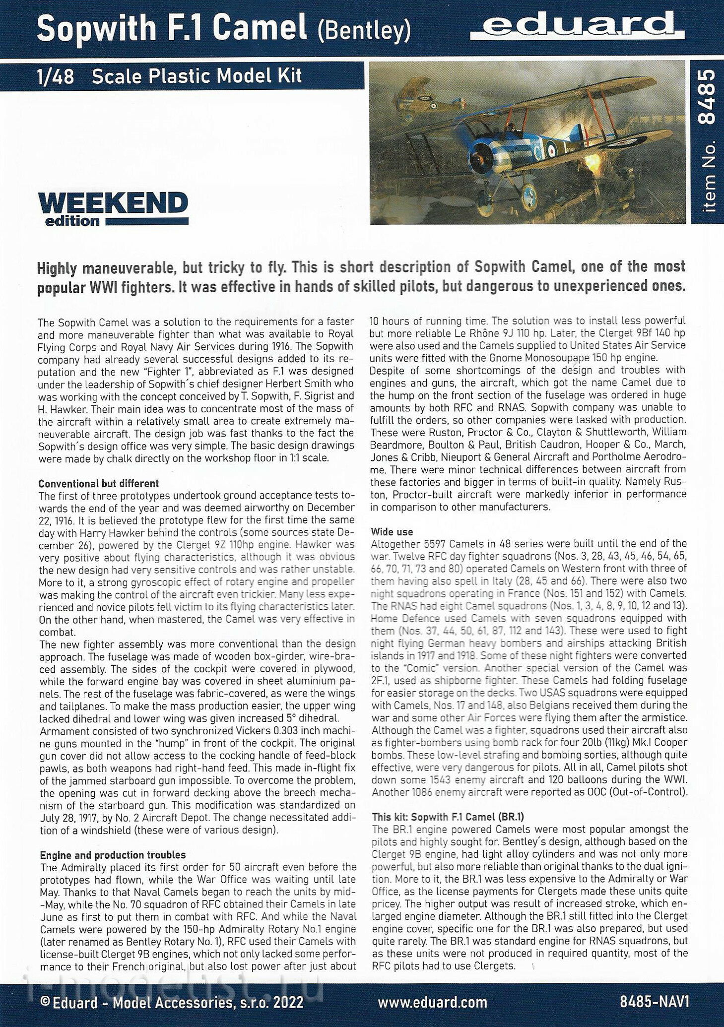 8485 Eduard 1/48 Sopwith F.1 Camel fighter with Bentley BR engine.1 Weekend version