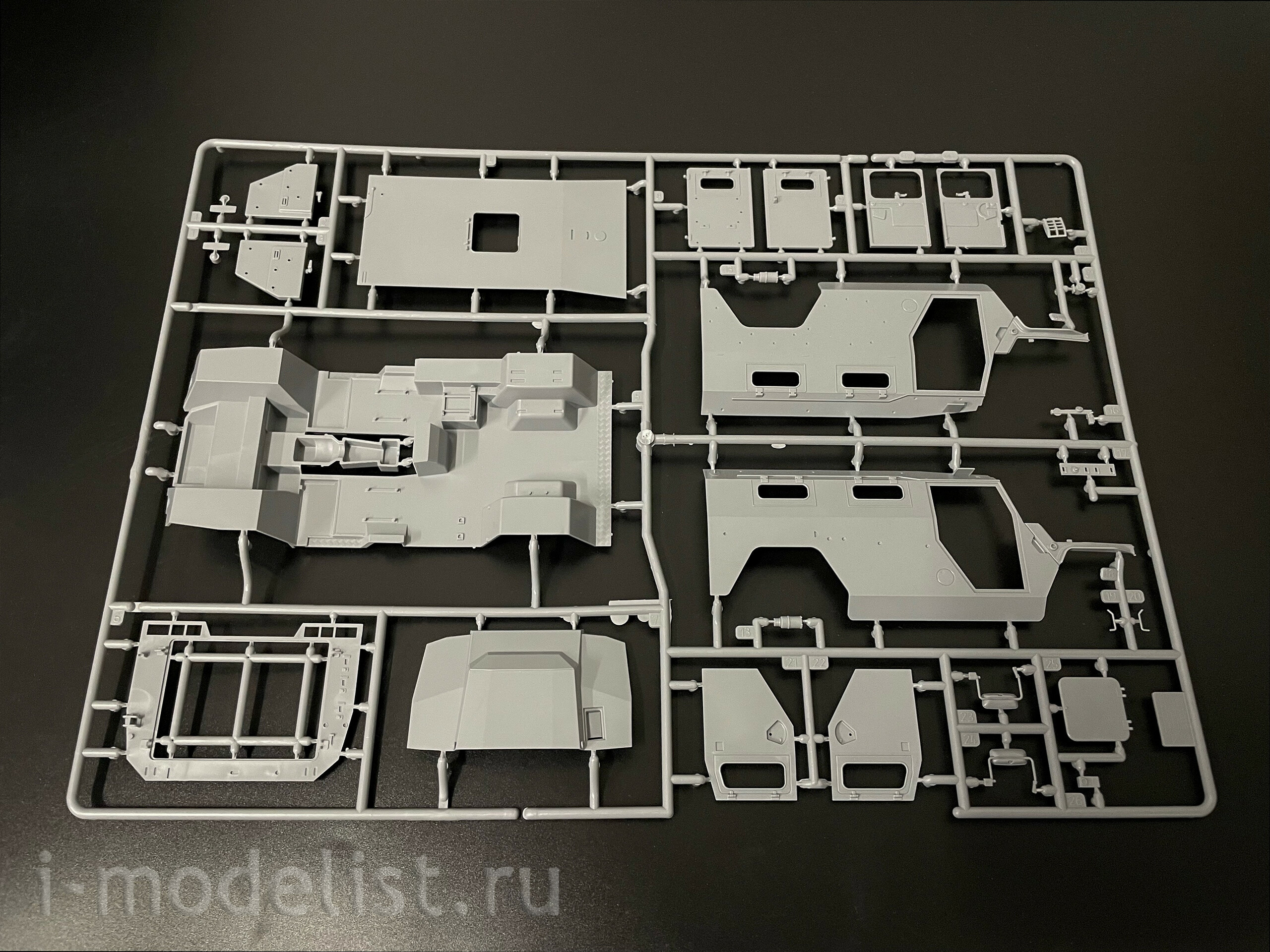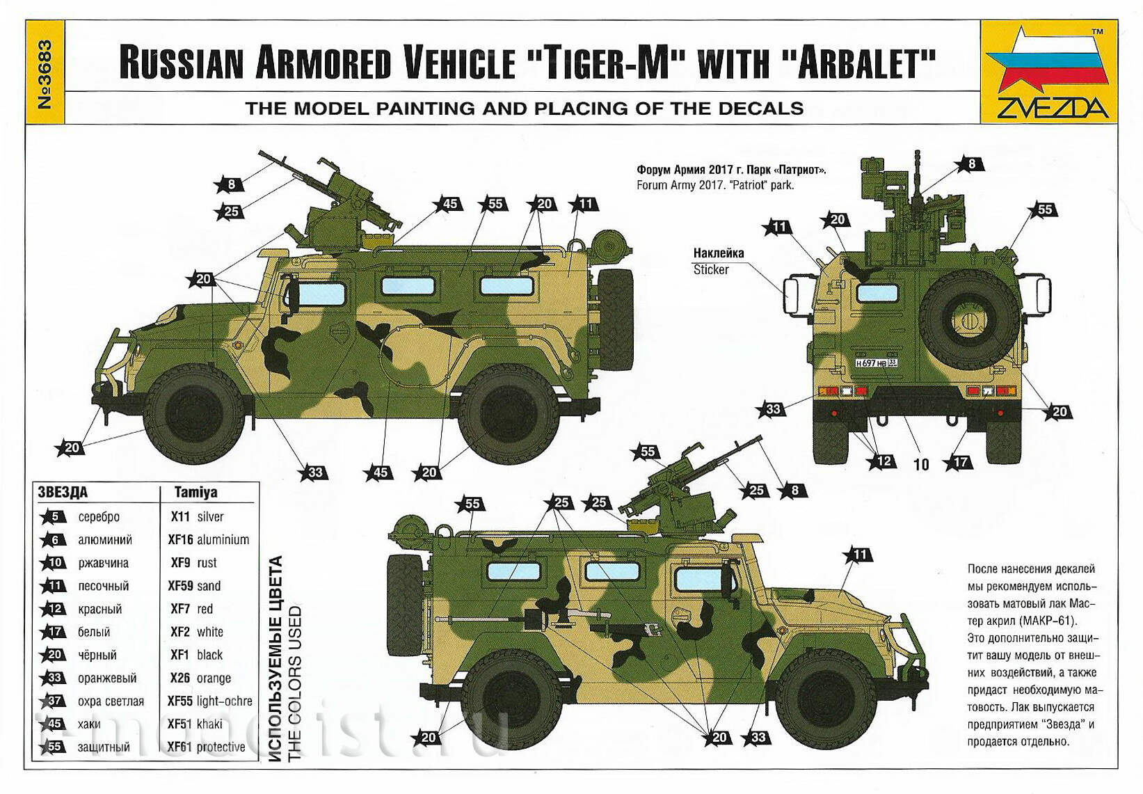 Armored car "Tiger" with a remotely controlled weapon module "Crossbow" – Russian multipurpose all terrain vehicle, armored, army vehicle SUV. Designed for transportation of people and various goods on roads and off-road. The car was demonstrated at the exhibition "Army-2016". The module "Crossbow" is a machine gun 12.7 mm "KORD" or a machine gun PKTM 7.62 mm and it also has four launchers smoke grenades 3D6, 3Д6М or 3Д17. "Crossbow-DM" is fully stabilized and has the ability to capture and automatic tracking, which allows the operator to conduct effective fire, both from the spot and in motion. The toy is assembled using a special glue produced by the enterprise "Zvezda".
